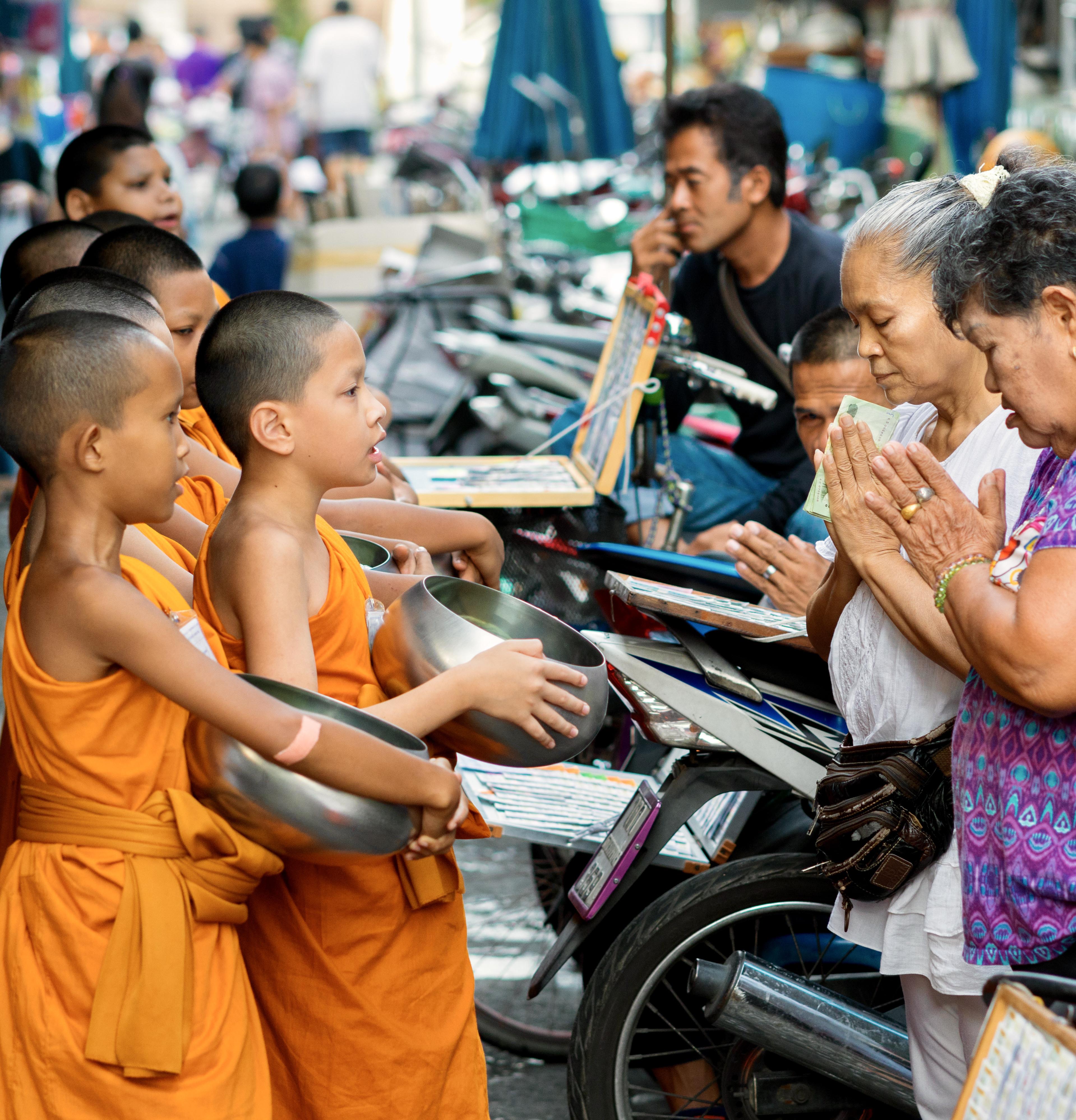 All’alba, quando Bangkok è ancora immersa nel silenzio, le strade si tingono del colore arancione delle tuniche dei monaci buddhisti. È il momento del Tak Baht, la cerimonia della questua: uno dei rituali più autentici e spirituali della Thailandia.