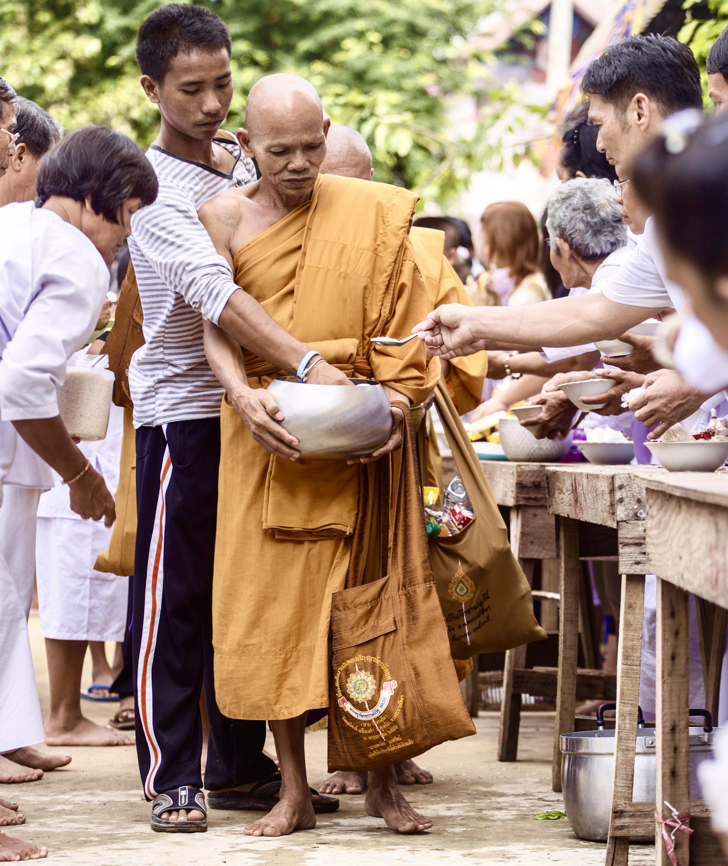 Nel buddhismo Theravada, i monaci vivono grazie alla generosità della comunità. Ogni mattina escono dai templi per ricevere cibo — riso, frutta, acqua — donato dai fedeli. Questo gesto, chiamato d?na, rappresenta la virtù della generosità: chi offre compie un atto di merito, chi riceve mantiene viva la propria disciplina e umiltà.